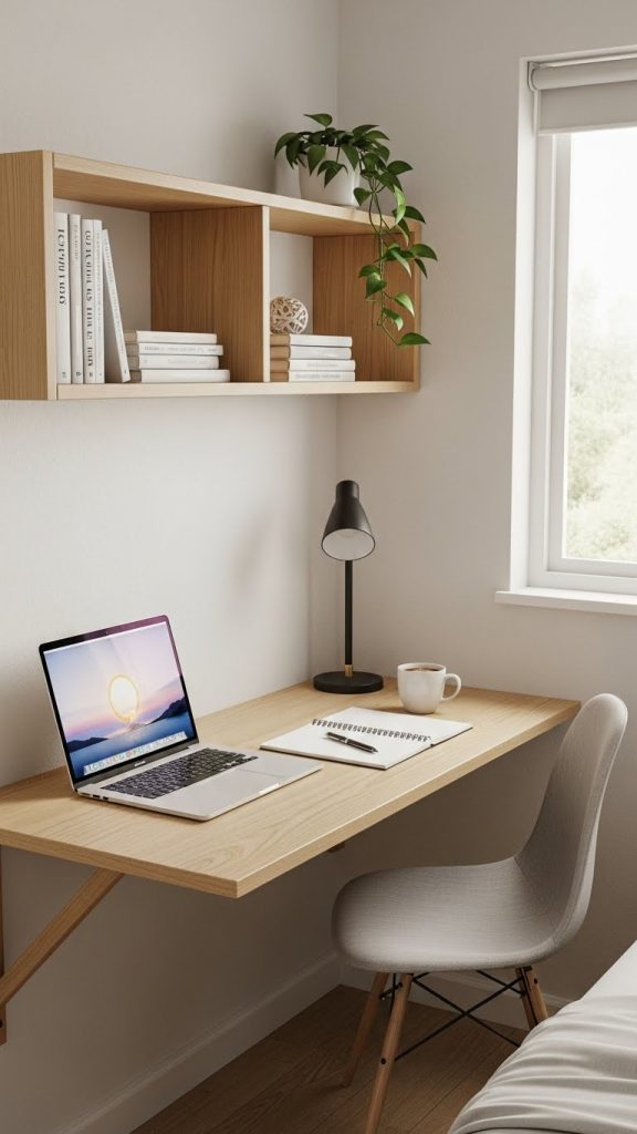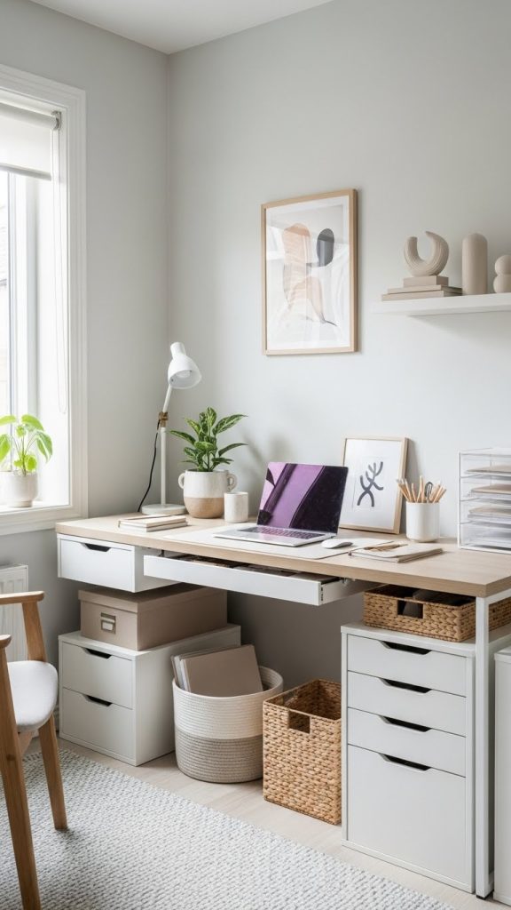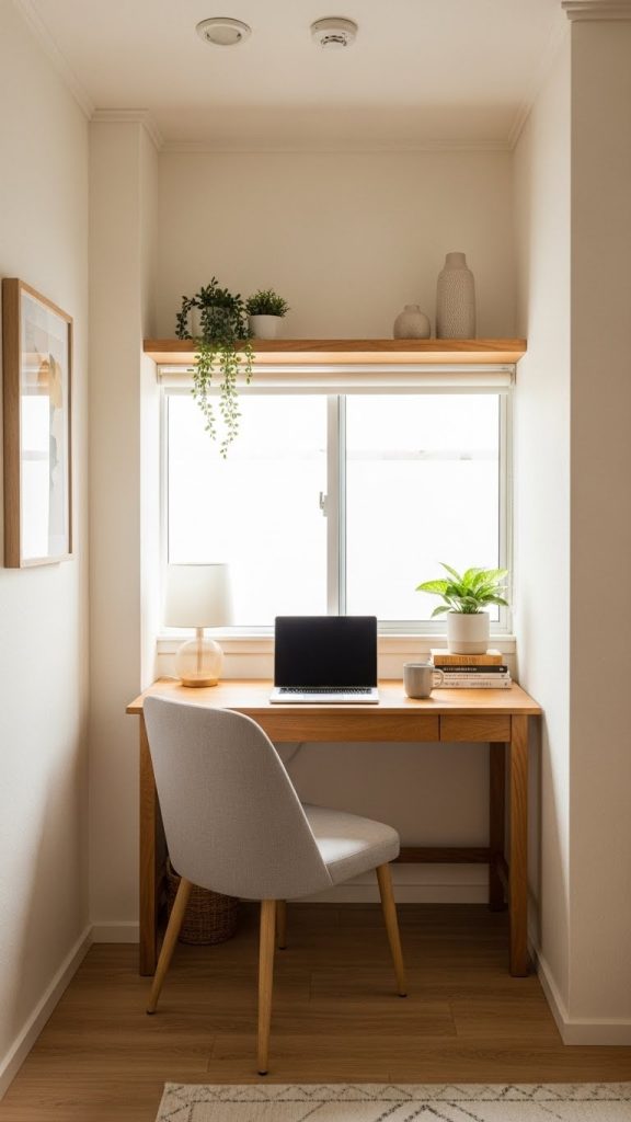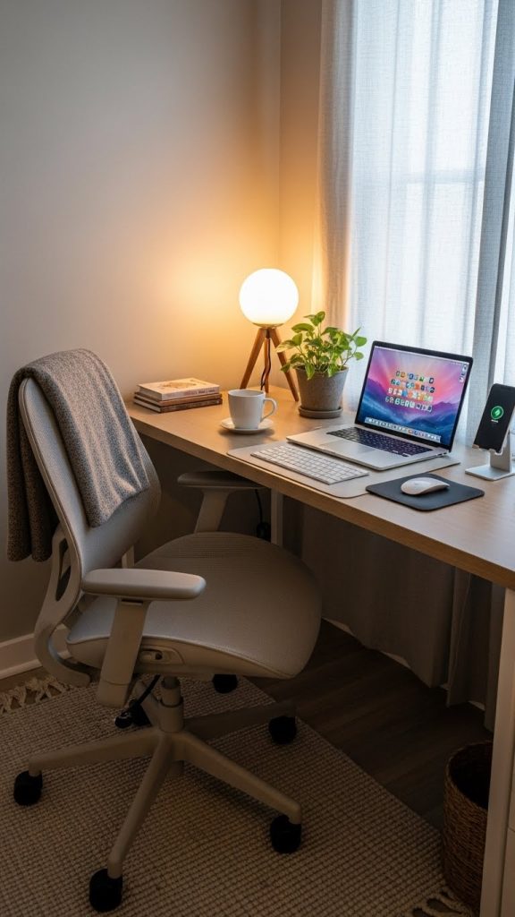 A cozy workspace does not mean bulky furniture. Clean lines and slim profiles help maintain an uncluttered look. If storage is limited choose a desk with built in drawers or shelves. This allows you to keep essentials close while reducing surface clutter.
