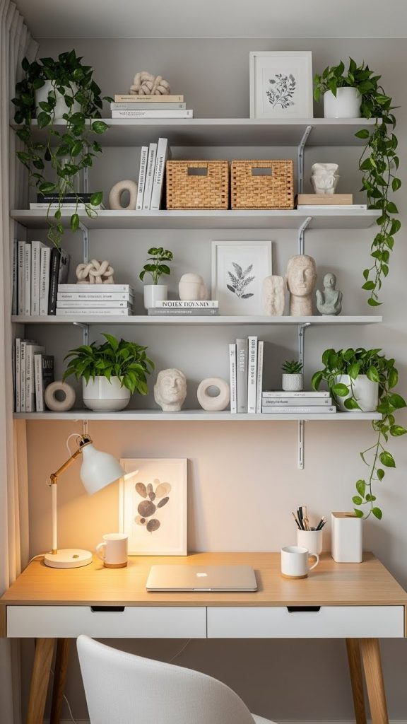 Use shelves to store books baskets files and decorative items. Mixing functional and decorative elements helps the space feel balanced rather than purely utilitarian. Wall mounted organizers pegboards or grid panels are also great options for storing supplies while adding visual interest.