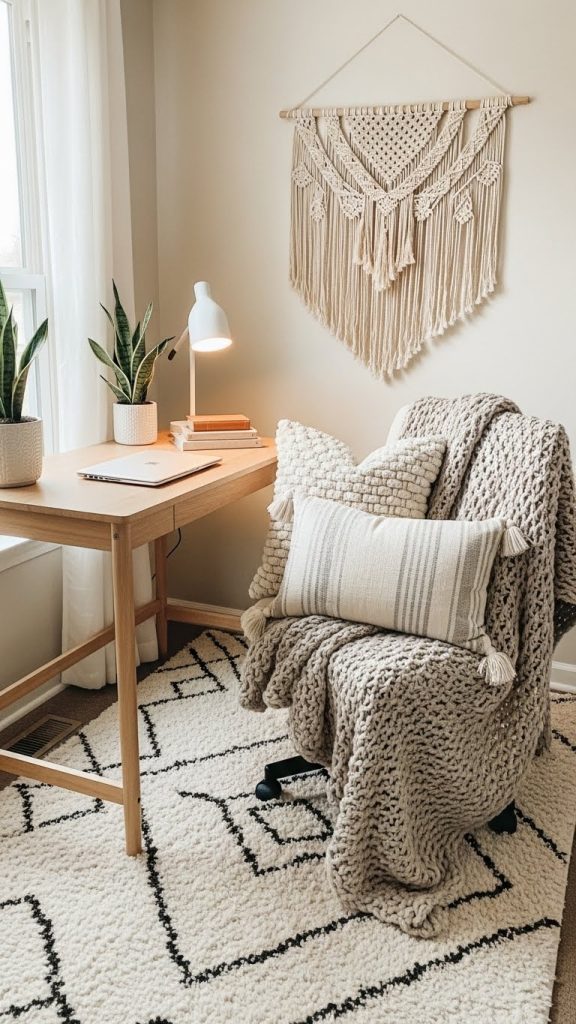 Texture is a key element in creating coziness especially in small spaces. Soft furnishings add warmth and comfort without requiring much room. A plush rug under your desk can instantly make your office feel more inviting while also defining the workspace.