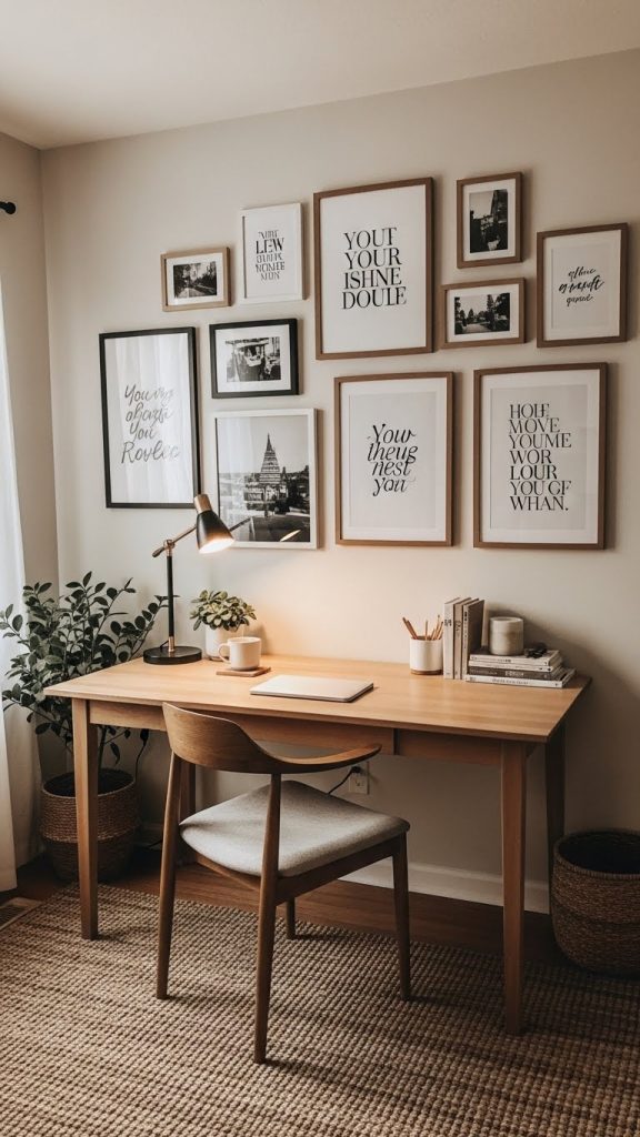 In a small space it is important to be selective. Choose a few meaningful pieces rather than filling every surface. A small gallery wall above the desk or a single statement art piece can add character without overwhelming the space.
