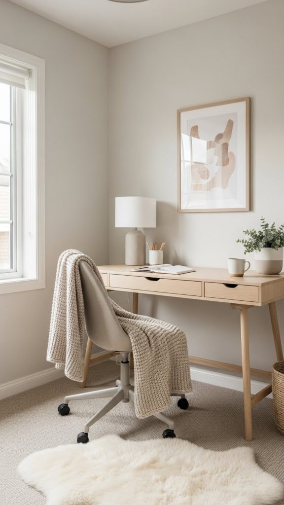 To add depth and warmth layer different shades of the same color family. For example pair a cream wall with a beige desk and a soft white chair. This subtle variation adds interest without overwhelming the space. A neutral base also allows you to easily change decor seasonally or add personal touches without clashing.