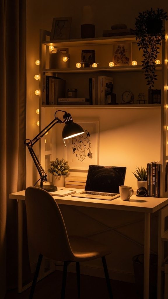 String lights or fairy lights can also add a soft glow and cozy charm especially when placed along shelves or around a window frame. The goal is to eliminate harsh shadows and create a gentle inviting atmosphere that makes working feel comfortable rather than stressful.