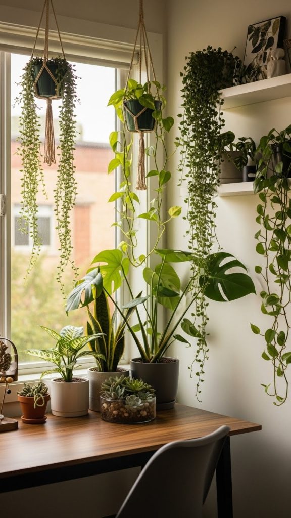 If desk space is limited choose small plants like succulents snake plants or pothos. Hanging planters or wall mounted plant holders are also great options for saving space. Plants placed on shelves or windowsills add greenery without cluttering the desk.