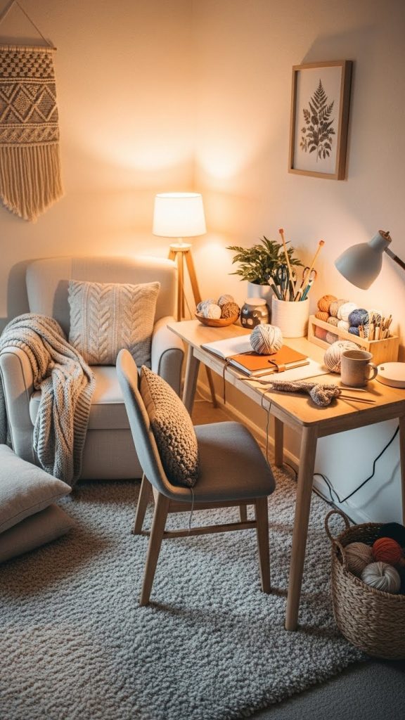 A cozy craft nook focuses on comfort and warmth. This idea is perfect for journaling, knitting, hand lettering, or slow creative hobbies.