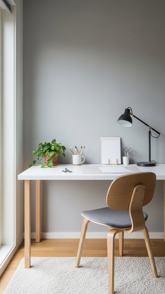 Choose a simple desk with clean lines and minimal storage. Keep only essential tools and supplies within reach. Store extra materials in labeled containers tucked away in drawers or cabinets.