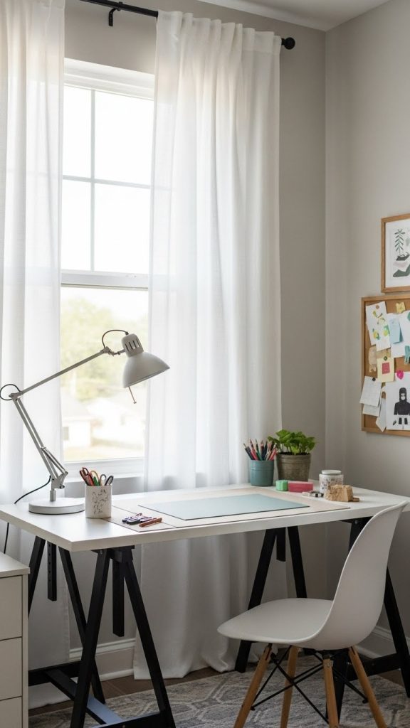 Wall art or inspiration boards should be intentional rather than crowded. Choose a few meaningful pieces that inspire creativity without distraction.