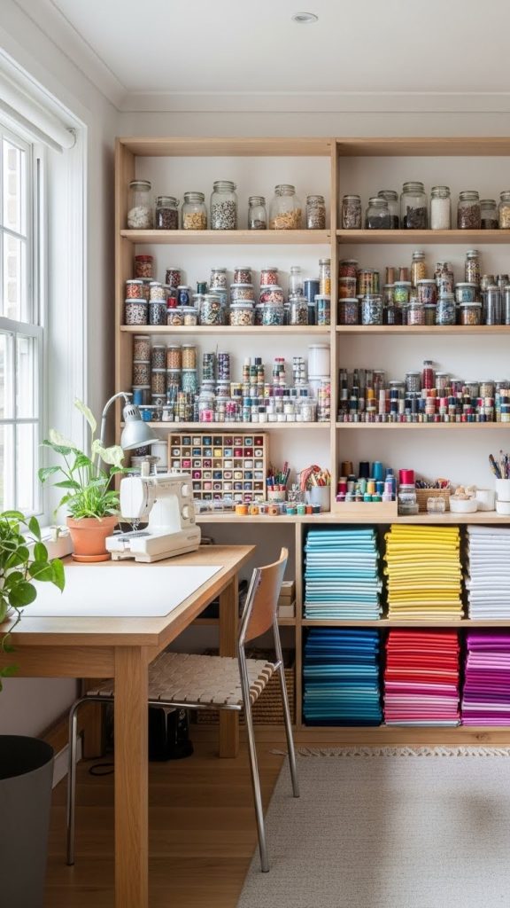 Open shelving is both functional and decorative, making it a popular choice for craft rooms. Shelves allow easy access to supplies while also displaying colorful materials as decor.