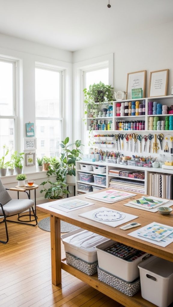 Invest in a sturdy work table that fits the scale of the room. A large table allows for cutting fabric, painting, or assembling projects. Surround it with shelving units to store supplies like paper, yarn, paints, and tools.