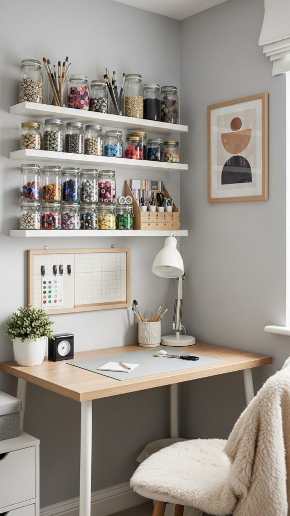 Install shelves above your workspace to store jars of paint, fabric, paper, or yarn. Use matching containers to keep the look cohesive.