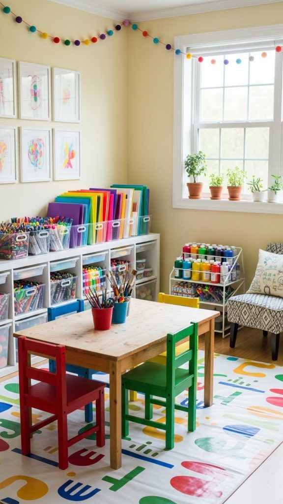 Choose durable furniture that can handle paint, glue, and markers. A child height table with comfortable chairs makes crafting accessible and fun. Use clear bins so kids can easily see and find supplies.