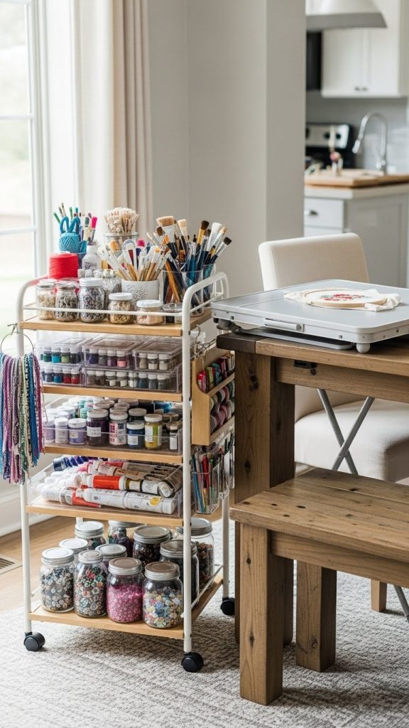 A mobile craft station is perfect for people who like flexibility or need to share space. Using rolling carts, portable tables, and stackable storage allows you to craft anywhere in the home.