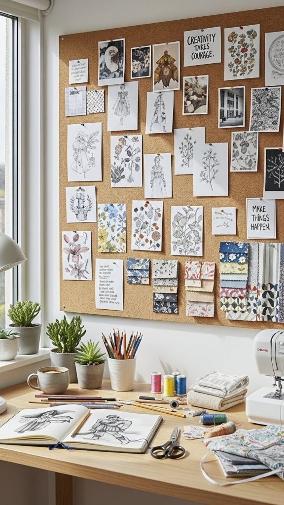 Use cork boards, pin boards, or magnetic boards to display ideas, sketches, fabric samples, and quotes. Arrange items in a way that feels inspiring rather than chaotic.