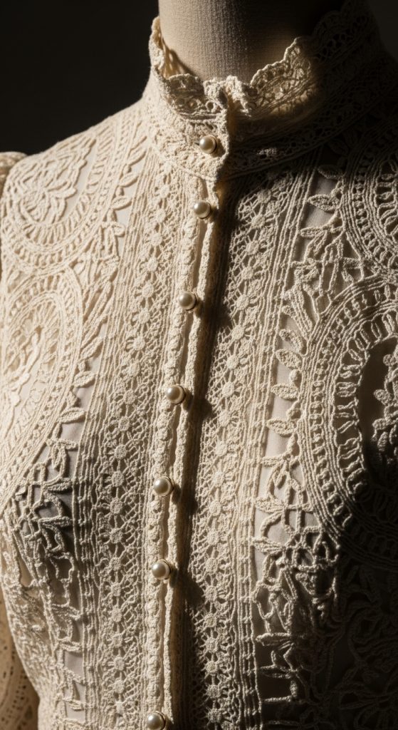 This blouse is the height of sophistication. Featuring a high neck and delicate lace clusters, it mimics the intricate styles of the 1900s but with a modern, lightweight twist. Itโs perfect for pairing with high-waisted trousers.