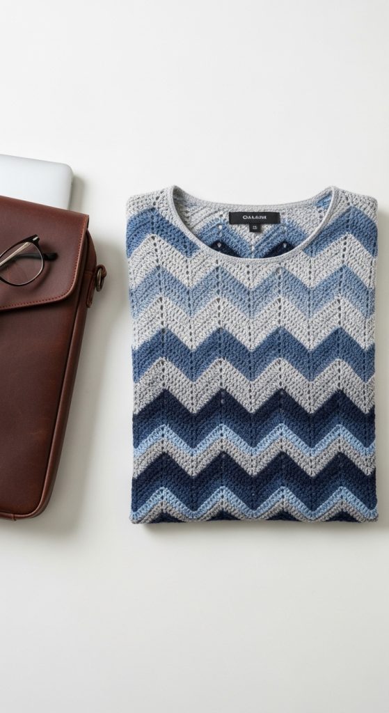 Chevron (or ripple) stitches aren’t just for blankets! When done with a fine-weight yarn, they create a beautiful zigzag pattern that naturally flatters the torso. Itโs an excellent office-wear option.
