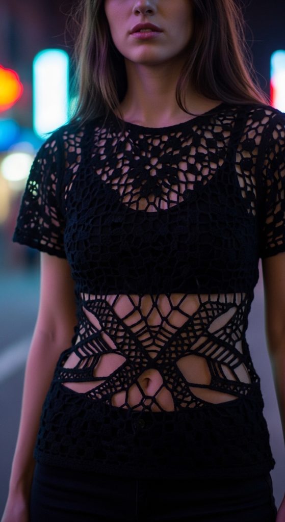 If you like a modern, “edgy” look, this blouse uses negative space. It features solid sections joined by “spider-web” or geometric lace, creating built-in cut-outs at the waist or shoulders.