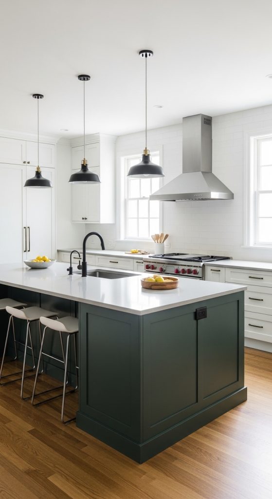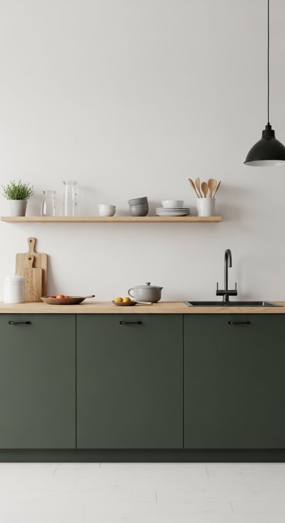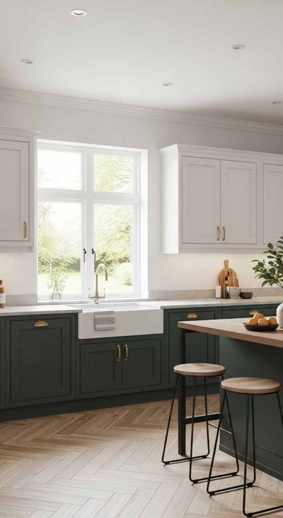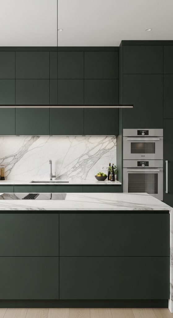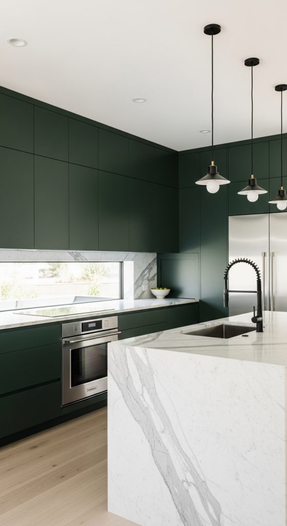 The deep green color creates contrast while the white surface keeps the kitchen bright and balanced. Marble or quartz countertops work especially well with this design.