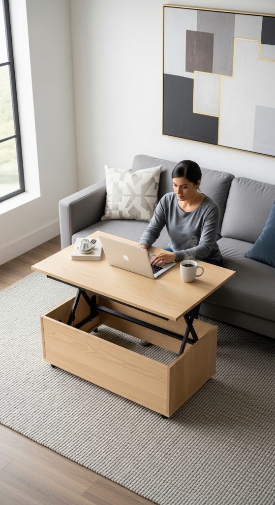 - A coffee table with a lift-top that doubles as a desk.