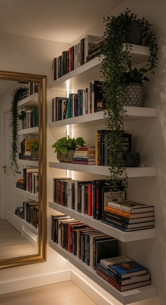 When you run out of floor space, look up! Using the full height of your walls draws the eye upward and provides massive amounts of storage. Floating shelves that go all the way to the ceiling make a room feel grander and more architectural.