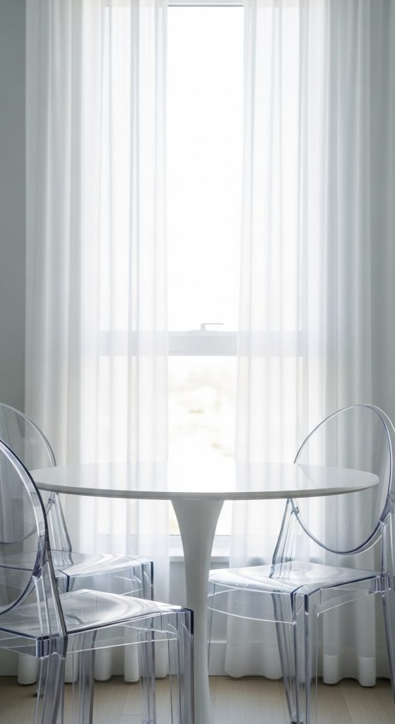 Furniture made of acrylic or glass (often called “Ghost” furniture) is a small-space superpower. Because these items are transparent, they have zero “visual weight.” You get the function of a chair or table without it cluttering up the view.