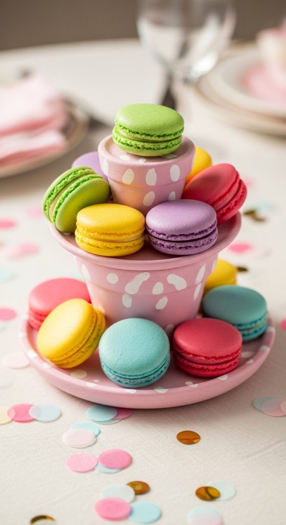 This is one of the most creative 10 DIY Clay Flower Pot Crafts Ideas for parties. By flipping pots upside down and gluing saucers on top, you can create a beautiful tiered stand for cupcakes, cookies, or fruit.