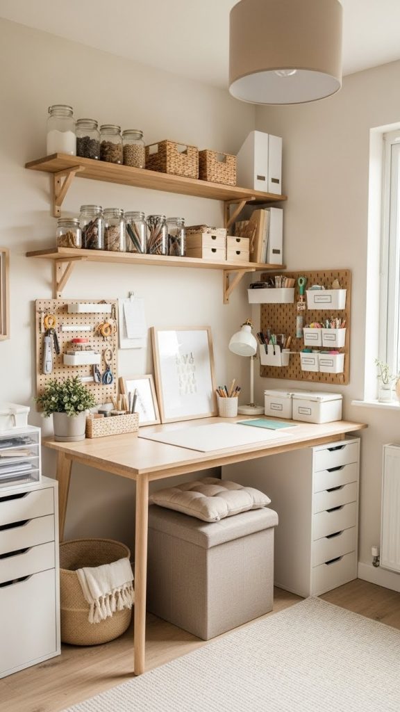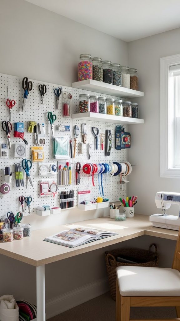 Install pegboards, floating shelves, or wall mounted cubbies to store tools, materials, and decor. Pegboards are especially versatile because you can rearrange hooks, baskets, and shelves as your needs change. They are perfect for scissors, rulers, paint brushes, washi tape, and small bins.