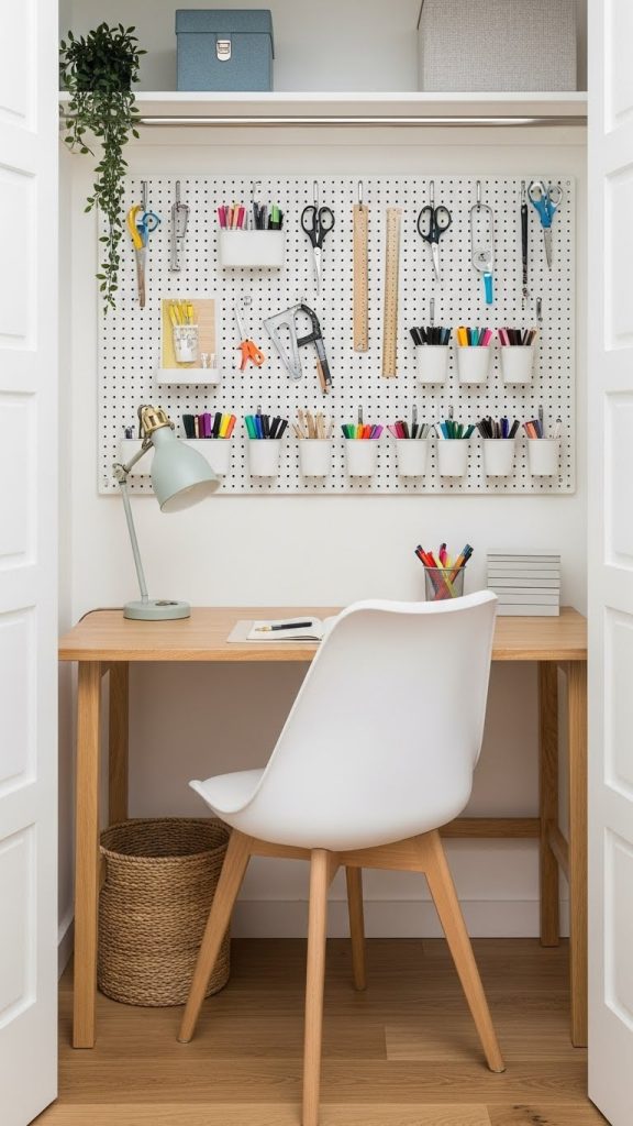 Use the back wall for pegboard or corkboard to hang tools and display inspiration. Good lighting is essential in a closet craft room, so add LED strip lights or a bright task lamp.