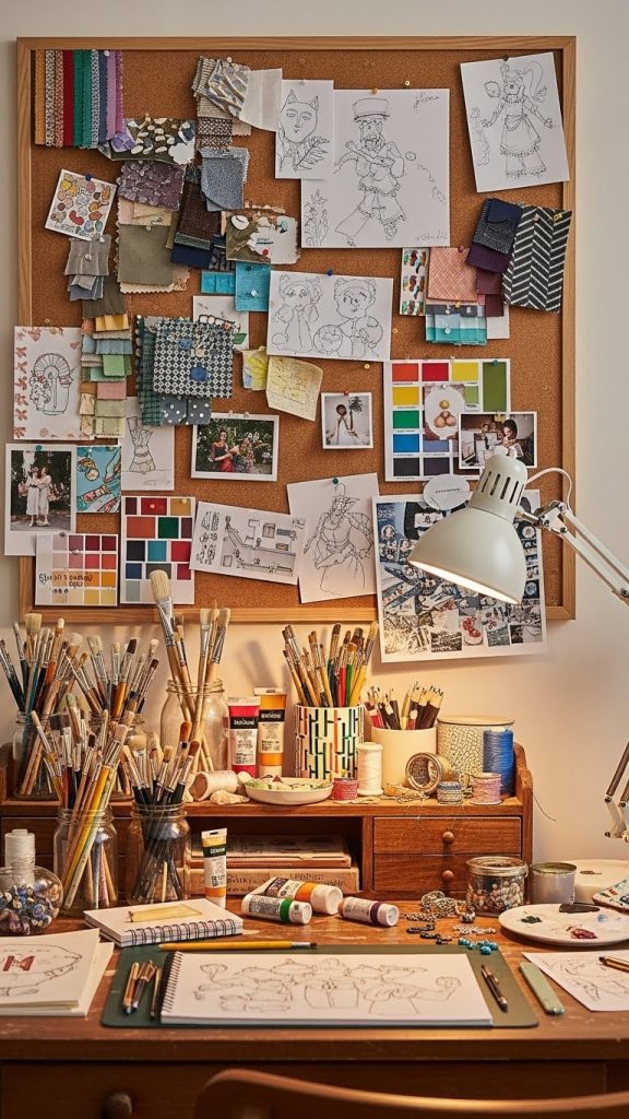 Use corkboard, magnetic board, or wire grids to display color palettes, fabric swatches, sketches, and photos. Keeping inspiration visible helps spark ideas and keeps you motivated.