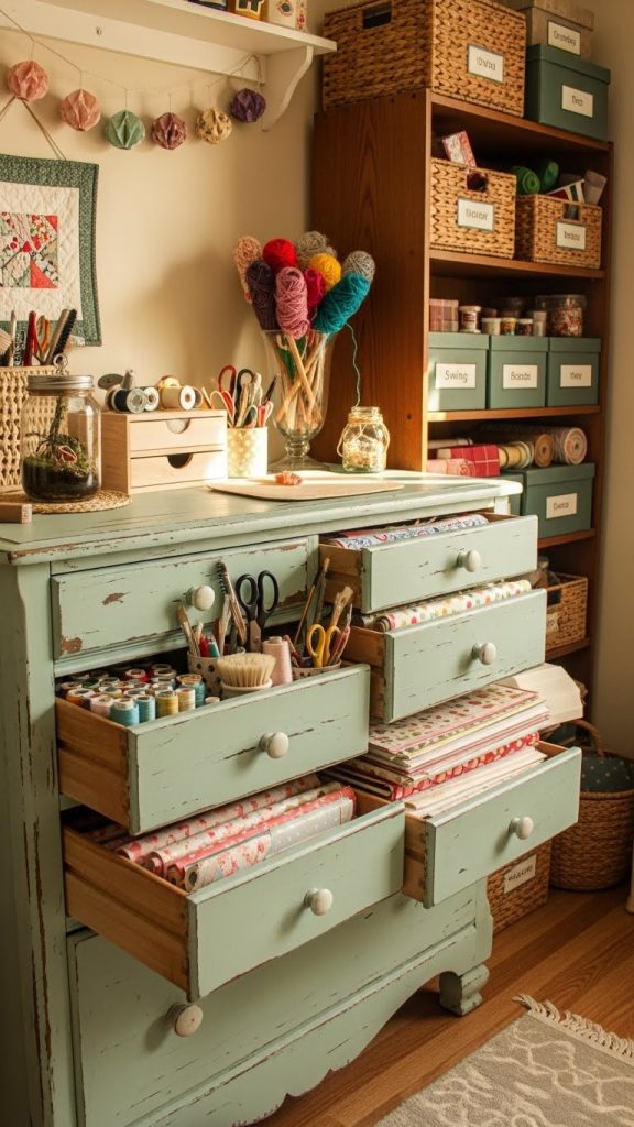 Old dressers can become supply storage with a little paint and new drawer pulls. Each drawer can be assigned to a specific category such as paper, fabric, yarn, or tools. Shallow drawers are great for organizing small items with dividers.