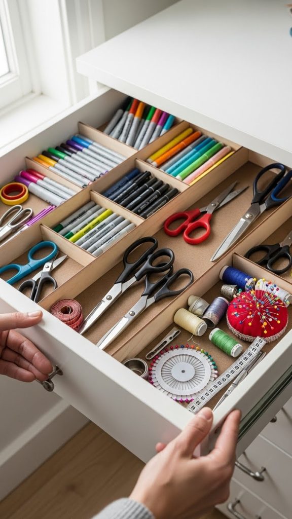 You can make dividers using cardboard, foam board, or thin wood strips. Measure your drawers and create compartments that fit your specific supplies. This works well for markers, pens, sewing notions, or scrapbooking tools.