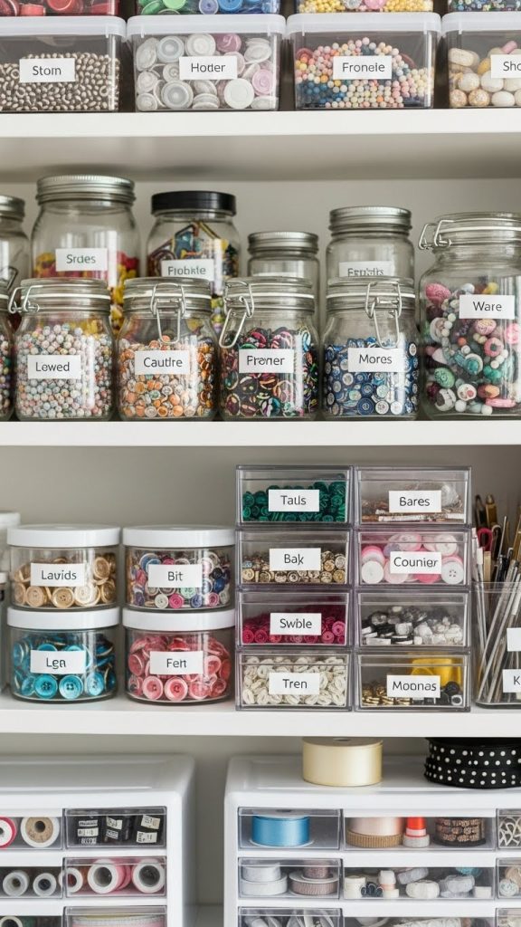 Use clear bins, jars, and drawers to store beads, buttons, ribbons, and small tools. Because you can see everything at a glance, you are less likely to buy duplicates or forget about supplies you already own.