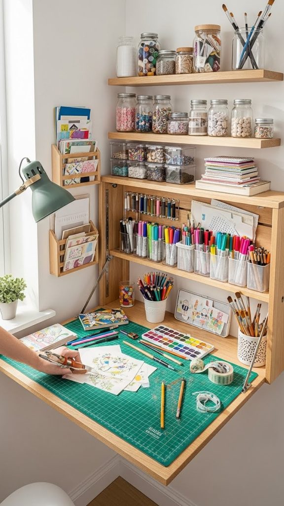 A dedicated work surface is essential, but in a small craft room, a full size table may not be practical. A fold down craft table is a smart DIY solution that provides workspace when you need it and disappears when you do not.