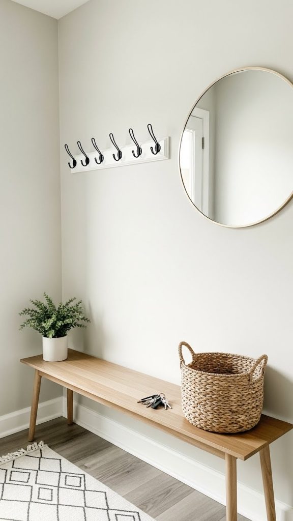 Install removable wall hooks for bags and coats. Add a small mirror to reflect light and make the space feel larger. A simple tray or basket can hold keys and everyday items.