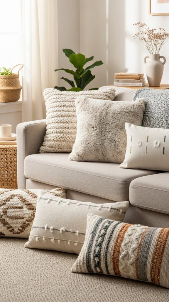 Mix textures like linen, cotton, and faux fur to add depth and interest. Changing pillow covers seasonally is also a great way to refresh your home throughout the year.