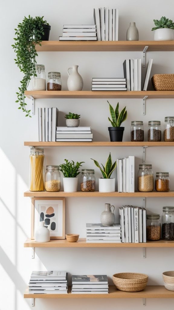 Use inexpensive brackets and wooden boards to create simple shelves. Style them with books, plants, framed photos, and everyday items like dishes or jars.