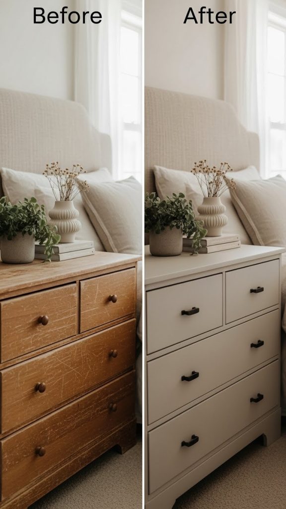 Before throwing out old furniture, consider giving it a makeover. Dressers, side tables, nightstands, and shelves can all be refreshed for under twenty dollars.