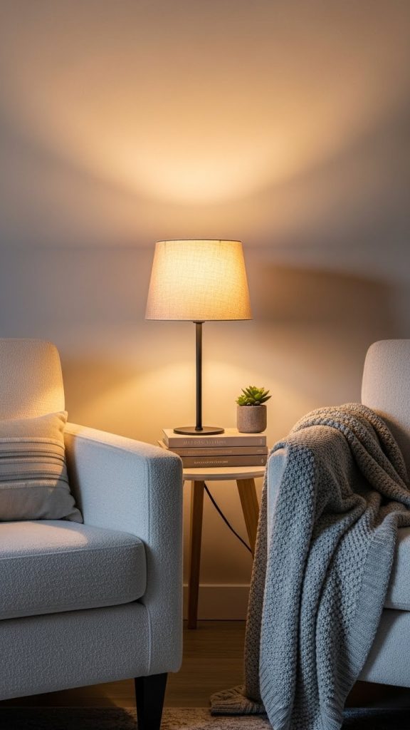 Swap out old lampshades for modern ones, or paint existing shades with fabric paint. Warm white bulbs create a cozy atmosphere, while brighter bulbs are better for workspaces.