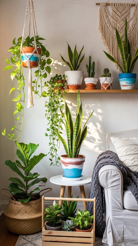 You can also make simple plant stands from wood or repurpose stools and crates. Hanging plants from hooks or rods adds visual interest and saves floor space.