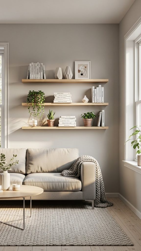 Floating shelves work beautifully in living rooms to display plants, books, and decor items. They are also great in kitchens for spices and dishes or in bathrooms for towels and toiletries. Keep the design simple by using straight lines and neutral colors.