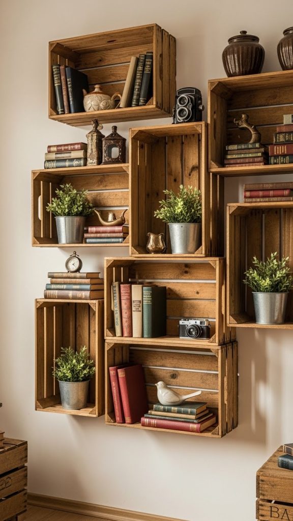 Wooden crate shelves are creative, affordable, and easy to install. You can use old wooden crates or buy new ones from craft or home stores. These shelves add a rustic and vintage touch to any room.