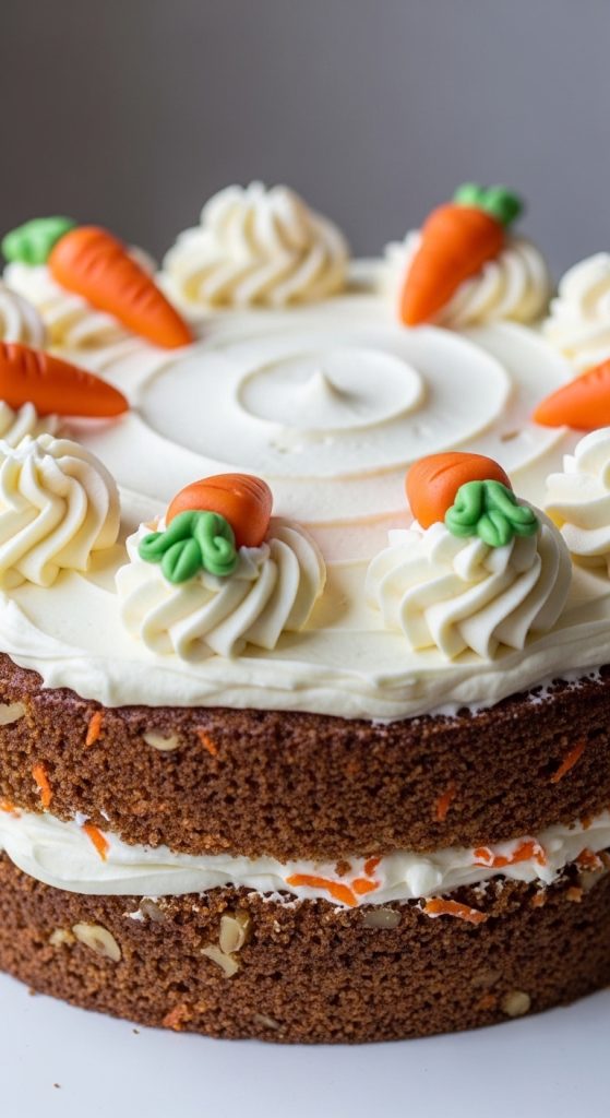 Top it with cream cheese frosting and decorate with small carrot-shaped decorations.