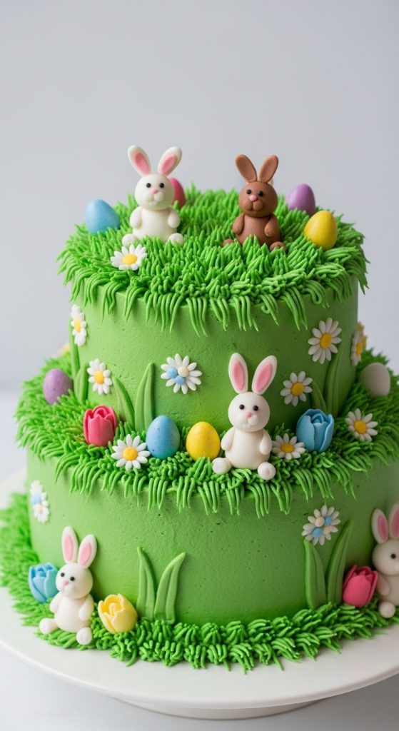 A bunny or nest topper can complete the cake design.