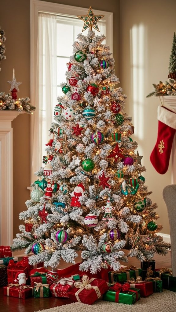 For a fun and festive approach, a multi-colored ornament theme can turn your flocked tree into a holiday centerpiece full of joy and cheer. This design works well in homes with kids or anyone who loves a lively, playful style.