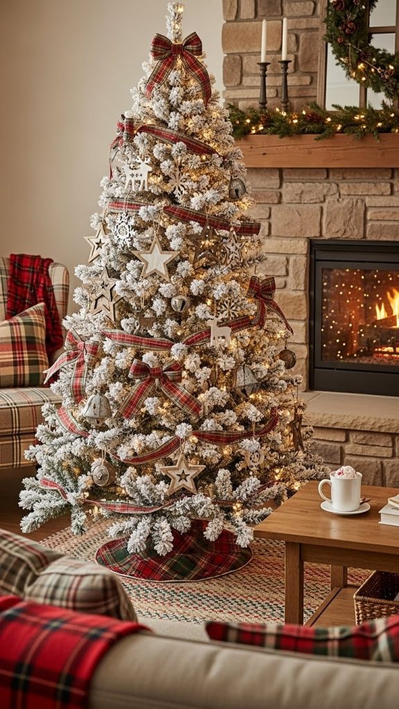 Plaid patterns are a holiday classic, and when paired with a flocked tree, they create a cozy, welcoming vibe. This design combines traditional charm with a touch of nostalgia.