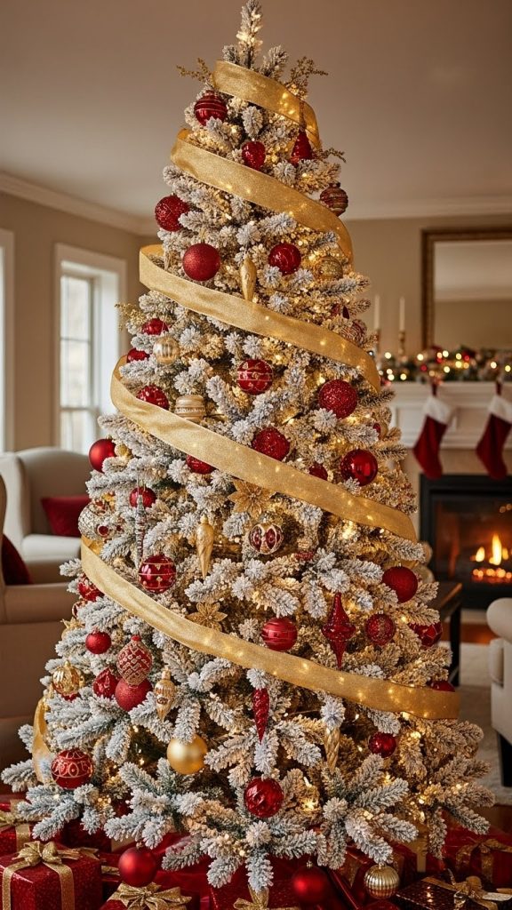 The key to this design is balance. Avoid overcrowding one area of the tree with ornaments. Distribute colors evenly, allowing the white flocking to peek through. This classic combination is perfect for those who love a timeless, festive look.