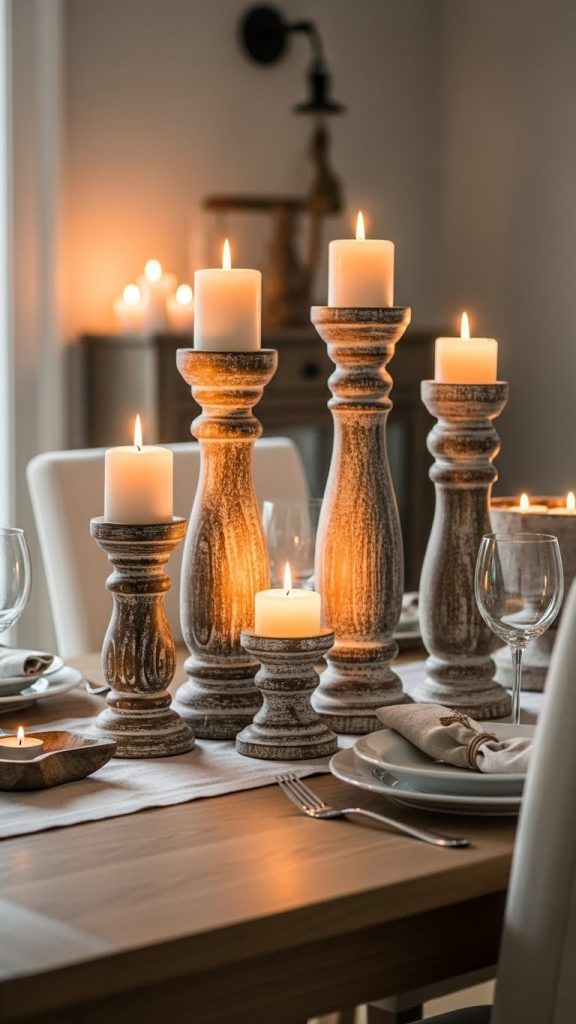 You can make block candle holders by drilling holes into thick wood pieces or create long wooden boards that hold multiple candles. Rustic candle holders made from reclaimed wood or tree branches are especially eye catching.