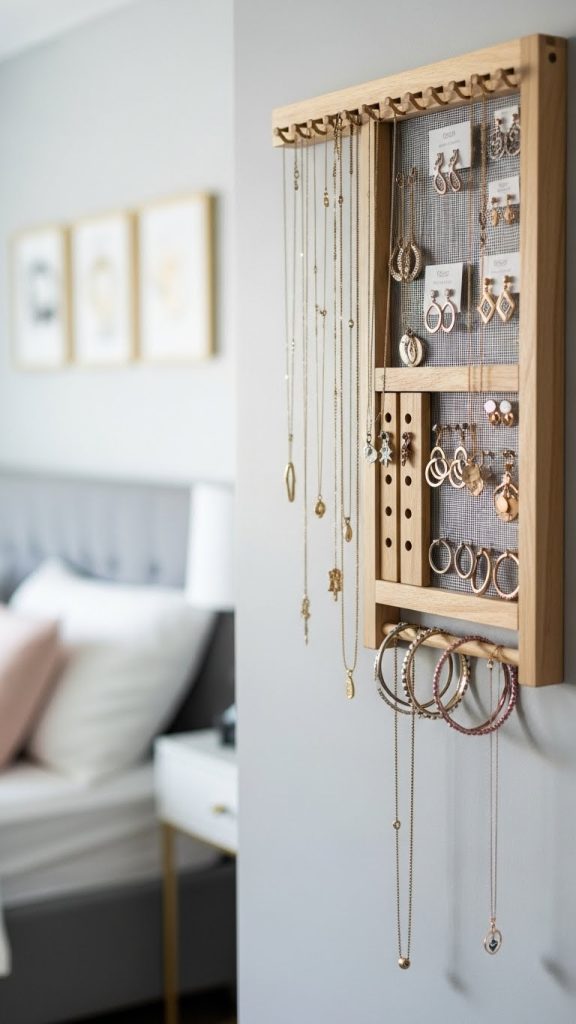 You can create wall mounted organizers with hooks pegs or dowels for necklaces and bracelets. Small wooden boxes or trays can be used for rings and earrings. Ladder style organizers are especially popular because they look stylish and are easy to make.