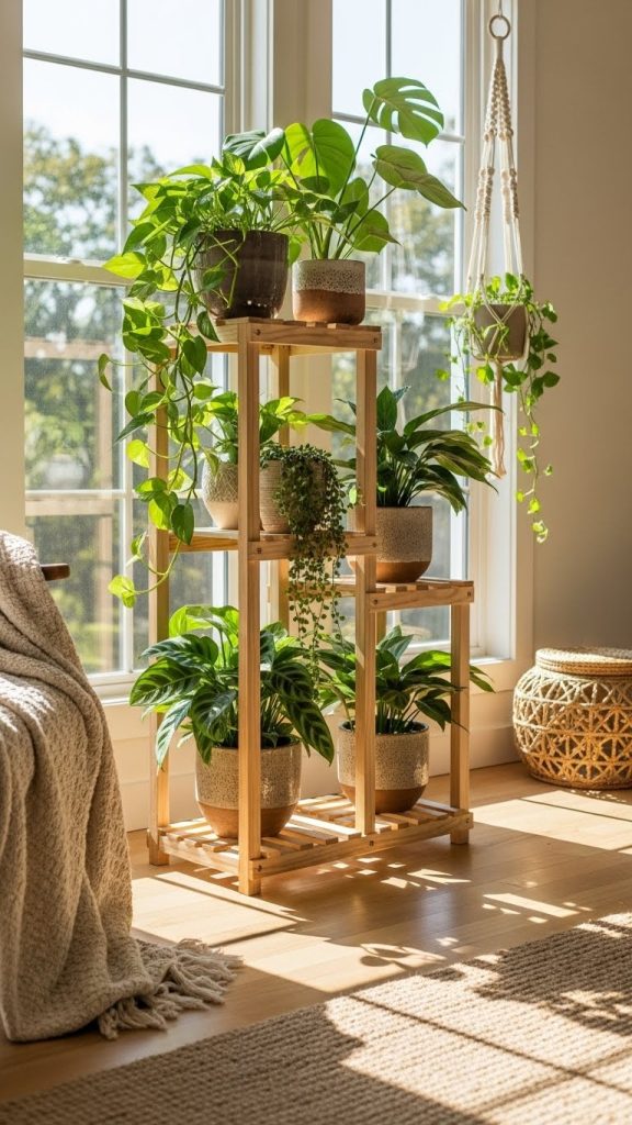 Wooden plant holders can be designed for indoor or outdoor use. Just make sure to seal the wood properly to protect it from moisture.