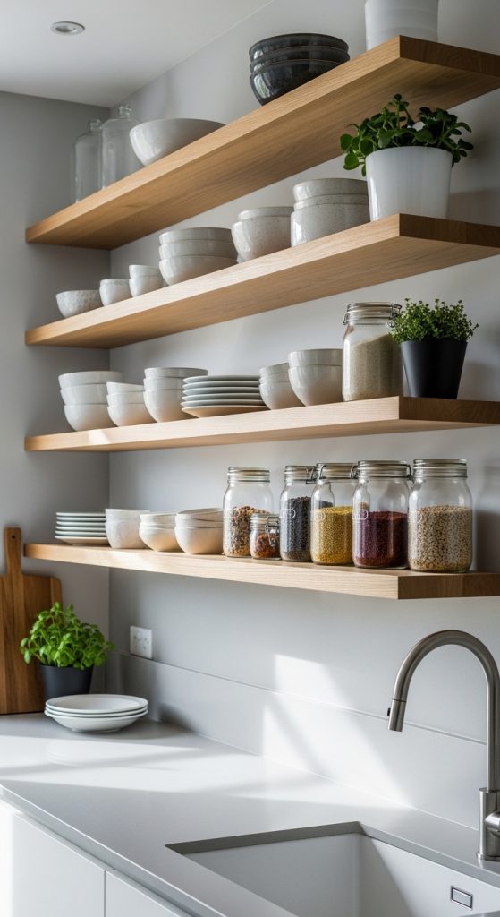 Open shelves allow you to display dishes, jars, and small plants while keeping everything easily accessible.
