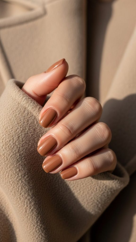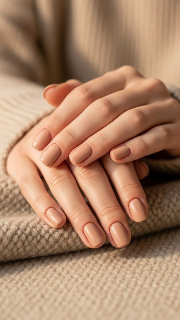 Short nude nails with brown undertones look especially elegant in winter lighting. They complement winter fashion trends like beige coats, brown boots, and neutral accessories.