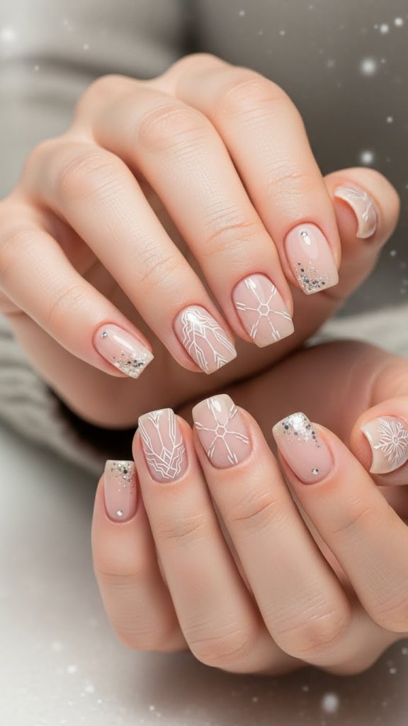 Adding subtle white details to nude nails is a perfect way to create a winter inspired look without going overboard. Think thin white lines, tiny dots, or minimal patterns.